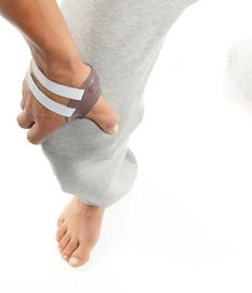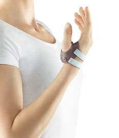 Trotz minimalen Eingriffs bietet die Daumenorthese dem Daumensattelgelenk maximale Stabilität. Ringförmig um das Gelenk gelegen sorgt eine rigide Schiene für festen Halt. Zwei um die Handfläche verlaufende Bänder fixieren die Orthese in ihrer Position.