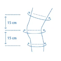 Für die Größenbestimmung der Dynamics Kniebandage mit Gelenk werden die Umfänge von Oberschenkel und Unterschenkel sowie des Knies gemessen.