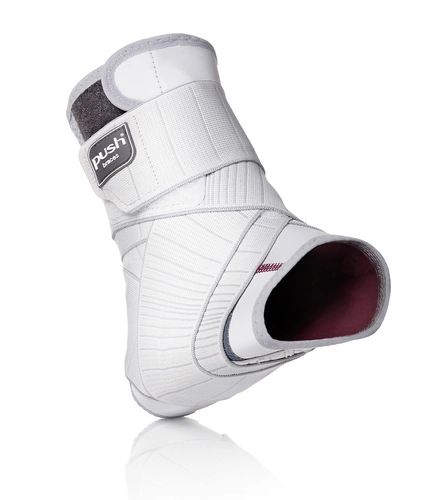 Die Push med Knöchelbandage ist für den linken und rechten Knöchel erhältlich und verfügbar in der Farbe Grau/Aubergine. Eine Anfertigung nach Maß ist möglich.